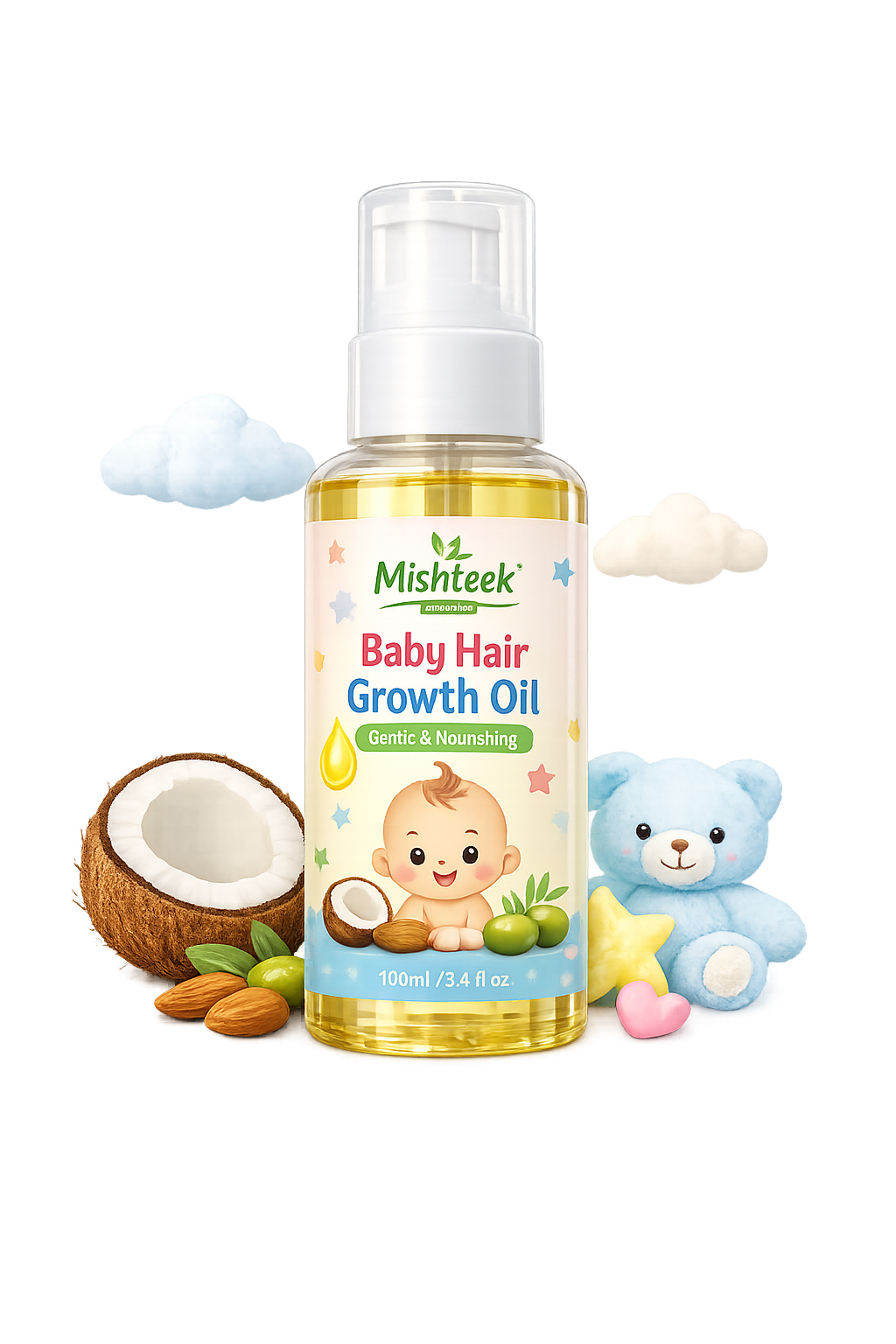 Mishteek Organics Baby Hair Growth Oil is carefully formulated with safe and mild natural ingredients to nourish baby hair and protect the sensitive scalp. Its gentle formula supports healthy hair growth and keeps baby hair soft and manageable.